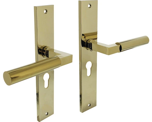 Deurkruk Bau-Stil is uitgevoerd in zamak en voorzien van een hoogwaardige messingkleurige PVD coating, waardoor hij een glanzende gouden uitstraling krijgt. Het design vloeit voort uit designstromingen uit de dertiger jaren, die gekenmerkt werd door Bauhaus en Jugendstil. Deze deurkruk op rechthoekig schild is voorzien van een profielcilindergat maat 55 mm. Het voordeel van deurkrukken op schild is dat ze vaak gaten afdekken die zijn achtergelaten door het vorige deurbeslag. Daarnaast is het schild geveerd zodat de deurkruk na gebruik weer terugveert naar zijn horizontale positie. Dit product wordt per paar geleverd inclusief bevestigingsmateriaal voor montage.