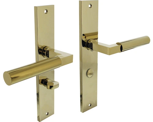 Deurkruk Bau-Stil vloeit voort uit de stromingen uit de dertiger jaren, die gekenmerkt werd door Bauhaus en Jugendstil. Deze strakke deurkruk op schild is uitgevoerd in zamak en voorzien van een messingkleurige PVD coating, waardoor hij een glanzende gouden uitstraling krijgt. Deurkruk Bau-Stil op schild is voorzien van een toilet-/badkamersluiting op 63 mm, waarmee u gemakkelijk een deur kunt openen en afsluiten. Daarnaast is het schild geveerd zodat de deurkruk na gebruik weer terugveert naar zijn horizontale positie. Het voordeel van deurkrukken op schild is dat ze vaak de gaten afdekken die voorheen in de deur zaten. Deze deurkruk op schild met schroefgaten wordt per paar geleverd inclusief bevestigingsmateriaal.