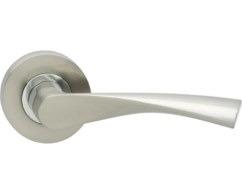 Deurkruk Giussy op rond rozet heeft een bijzondere kleurencombinatie en is uitgevoerd in mat nikkel en glanzend chroom. Deze deurkruk wordt per paar geleverd en het rozet is voorzien van nokken, waardoor de deurkruk beter op zijn plek wordt gehouden.