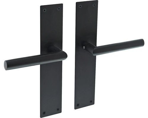 Deurkruk Jura op een blind rechthoekig schild is uitgevoerd in mat zwart. Deze deurkruk wordt per paar geleverd en het schild is voorzien van schroefgaten. Het voordeel van deurkrukken op schild is dat ze vaak de gaten afdekken die voorheen in de deur zaten.