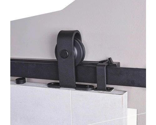 Dit stalen schuifdeursysteem heeft een mat zwarte poedercoating en wordt op de bovenkant van de deur gemonteerd. De maximum draagkracht is 100 kg en het geheel is eenvoudig te monteren.