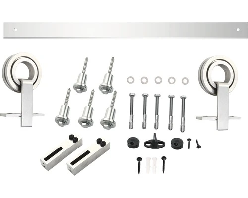 Daarnaast bestaat deze set uit twee hangrollen met open wiel en een lengte van 15,5 cm. Om voor een goede geleiding van de schuifdeur te zorgen, worden er roestvast stalen deurstoppers, afstandhouders en een vloergeleider meegeleverd.