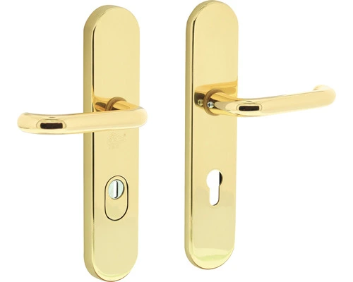 Deze ovale set achterdeurbeslag is uitgevoerd met extra bescherming tegen inbraak en is SKG*** gekeurd. Deze set heeft een profielcilindergat maat van 72 mm en heeft een aan beide zijden een passende deurkruk. Het veiligheidsbeslag is uitgevoerd in messing en naderhand gepolijst en voorzien van een laklaag, waardoor het een glanzende uitstraling heeft. Het veiligheidsbeslag is voorzien van kerntrekbeveiliging, waardoor de cilinder wordt beschermd tegen het uittrekken en uitboren van de cilinderkern. Kerntrekbeveiliging is sinds eind 2013 verplicht in nieuwbouw en sinds april 2014 ook voor bestaande bouw.