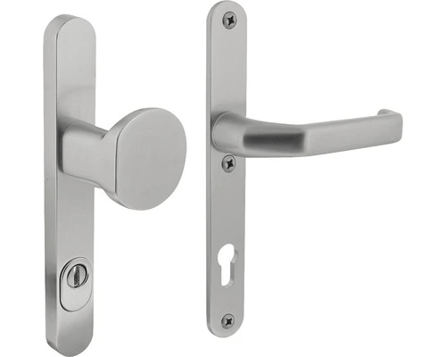 Deze ovale set voordeurbeslag op een smal schild bestaat uit aluminium en is hierdoor licht van gewicht en sterk tegelijk. Het veiligheidsbeslag is F1 gematteerd, waardoor het een zilverkleurige uitstraling krijgt. Het product is SKG*** gekeurd, wat betekent dat het om zwaar inbraakwerend beslag gaat. Daarnaast is het voorzien van kerntrekbeveiliging, waardoor de cilinder wordt beschermd tegen het uittrekken en uitboren van de cilinderkern. Deze set is voorzien van een greep aan de buitenzijde en een bijpassende kruk voor binnen en is zowel links als rechts toepasbaar. Het veiligheidsbeslag is geveerd en heeft een profielcilindergat maat van 92 mm.