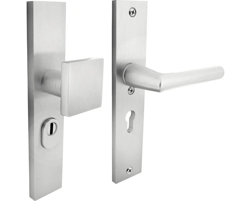 Deze rechthoekige set voordeurbeslag bestaat uit aluminium en is hierdoor licht van gewicht en sterk tegelijk. Het veiligheidsbeslag is F1 gematteerd, waardoor het een zilverkleurige uitstraling krijgt. Het product is SKG*** gekeurd, wat betekent dat het om zwaar inbraakwerend beslag gaat. Daarnaast is het voorzien van kerntrekbeveiliging, de cilinder wordt beschermd tegen het uittrekken en uitboren van de cilinderkern. Deze set is voorzien van een greep aan de buitenzijde en een bijpassende kruk voor binnen en is zowel links als rechts toepasbaar. Het veiligheidsbeslag heeft een profielcilindergat maat van 55 mm en is zowel links- als rechts toepasbaar.