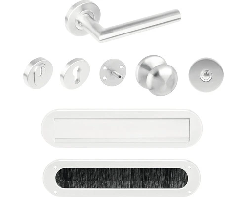 | Meegeleverd worden | Deurkruk Hoek 90° op rozet, Voordeurknop éénzijdige montage, Veiligheidsrozet met kerntrekbeveiliging, Deurbel, Brievenbus met klep/regenrand, Tochtwering, Bevestigingsmateriaal |